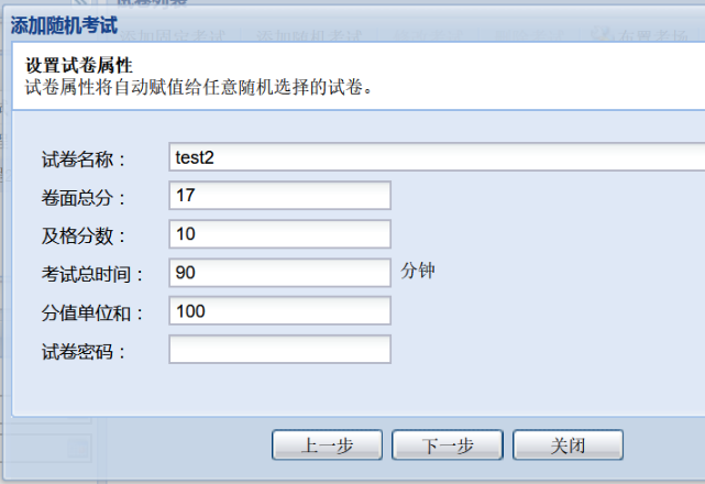 第一步:设置试卷相关属性,比如试卷名称,卷面总分,及格分等