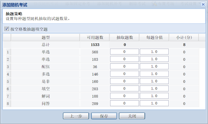 第四种随机方式:自定义题型题量为每个考生出题,填写随机试卷的相关属性,以及设置题型体量,截图说明:
